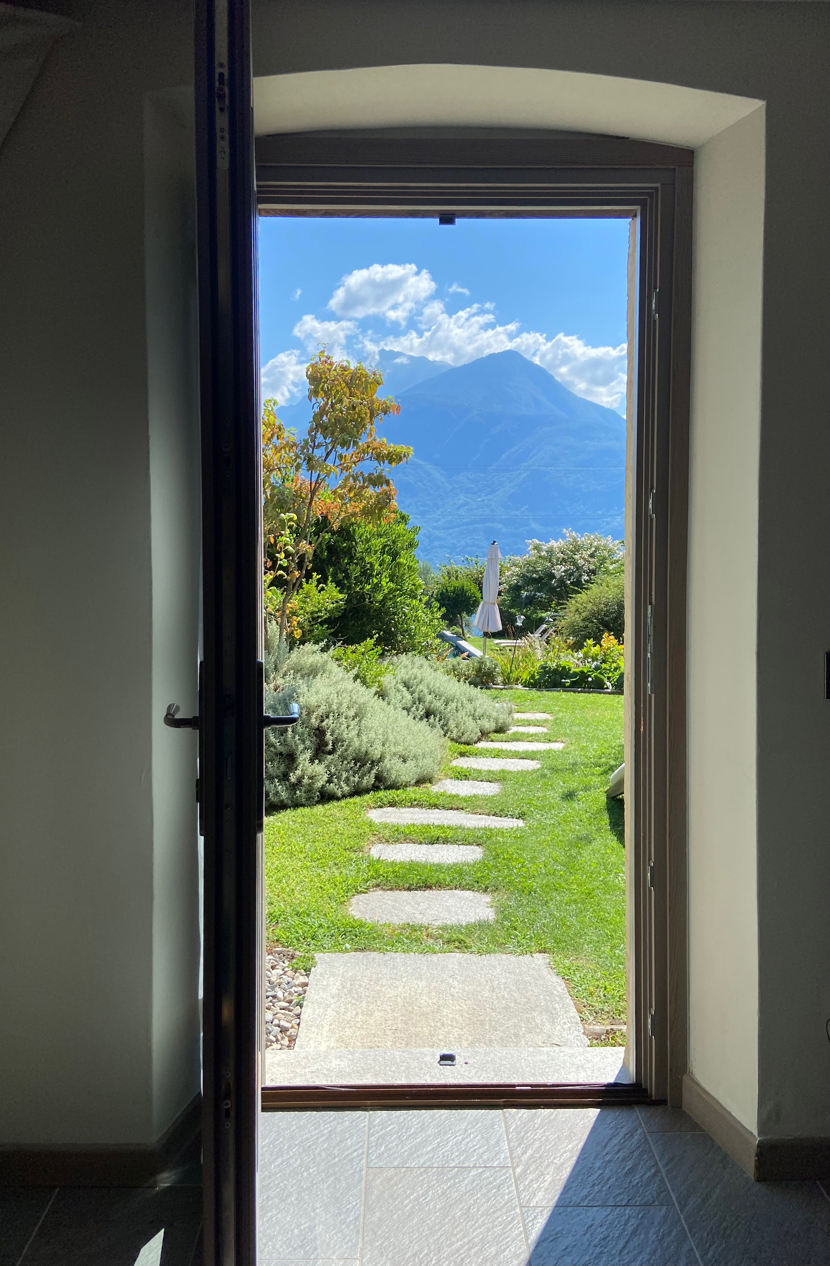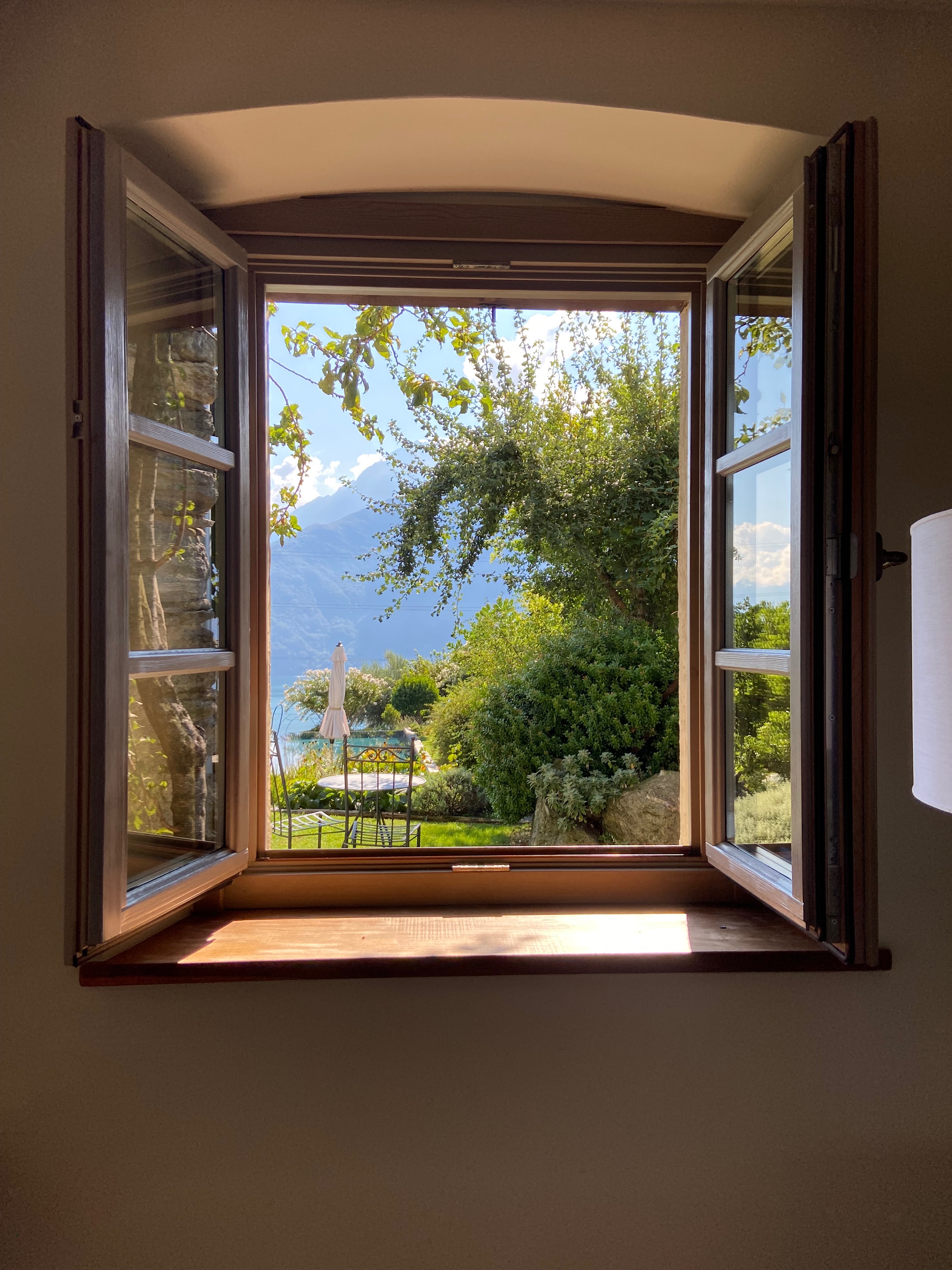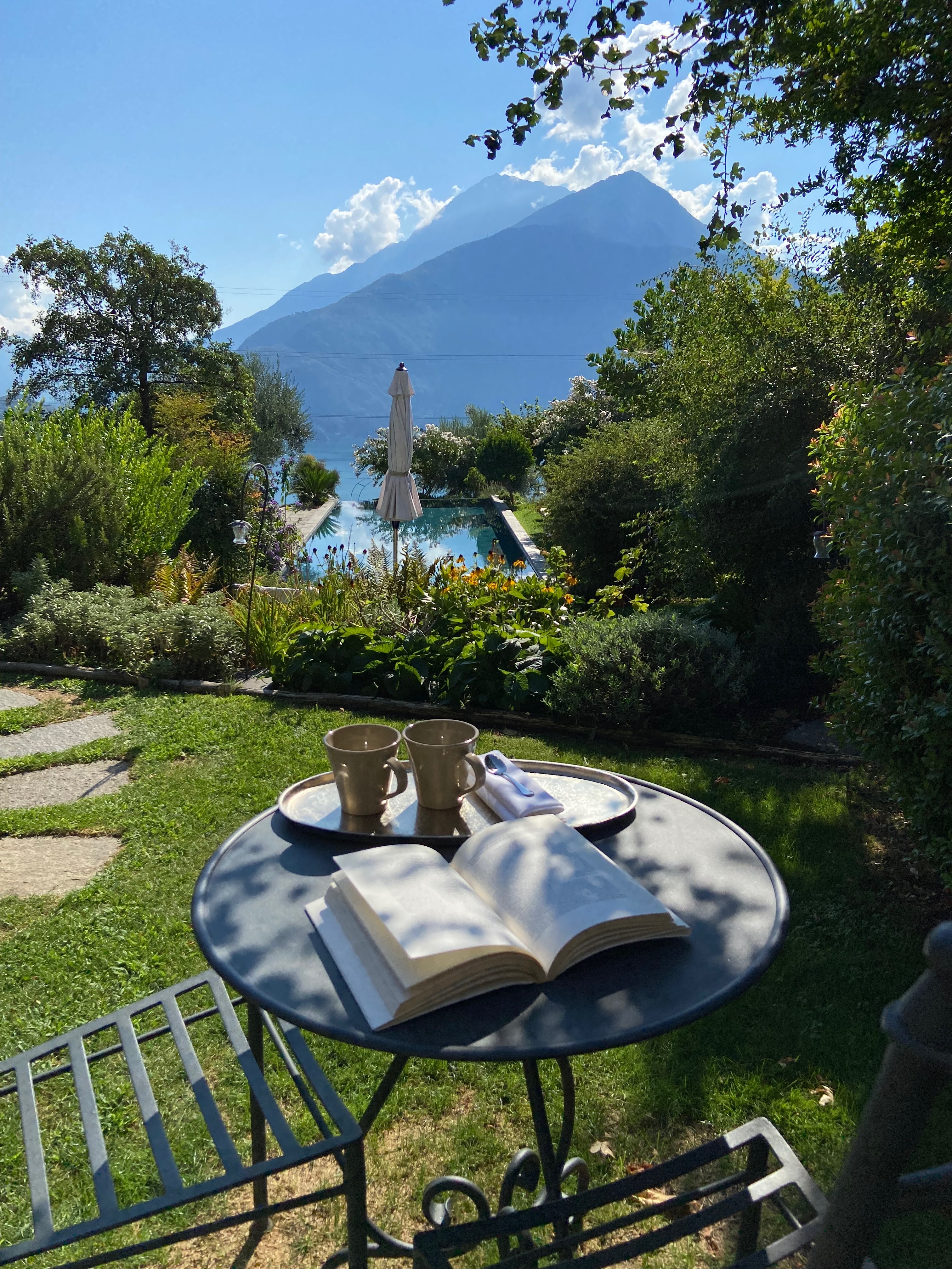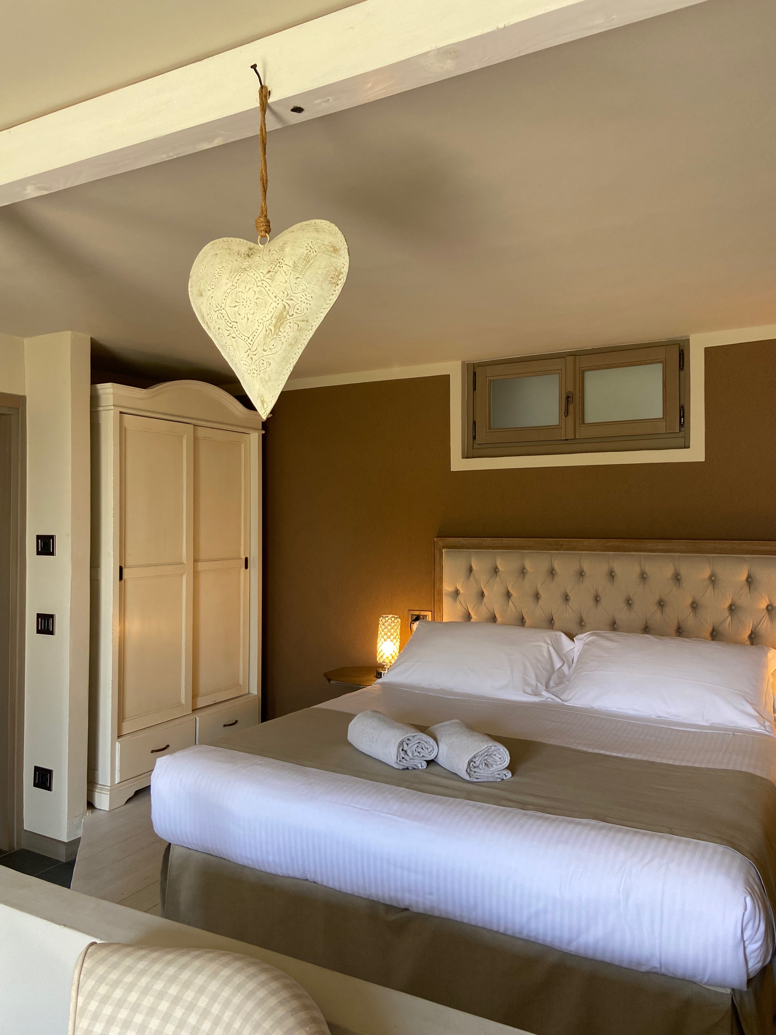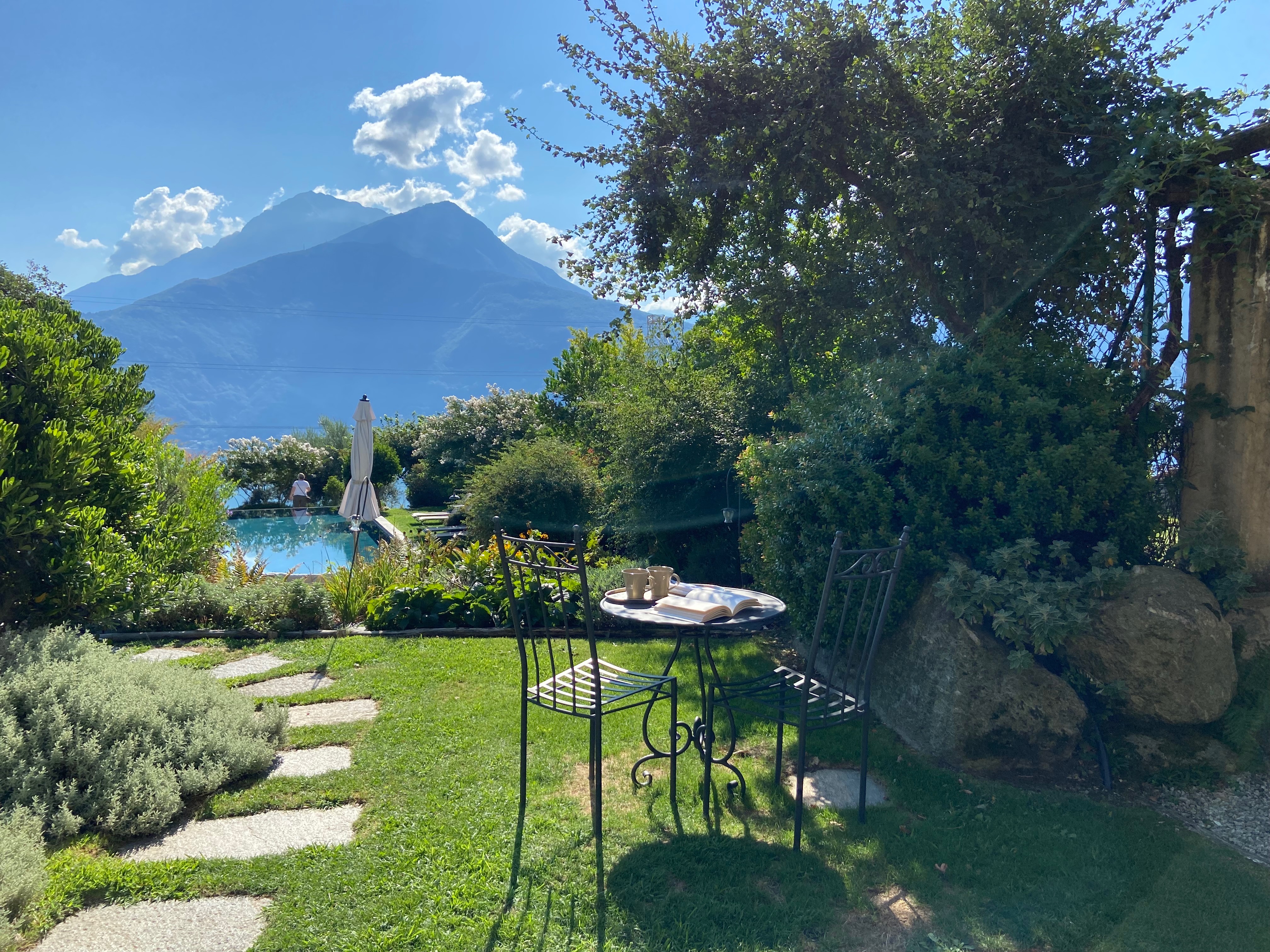 The Suite opens onto a private garden furnished with a table, chairs, and two sun loungers, boasting beautiful views of the lake and the pool; an ideal setting for peaceful outdoor moments.